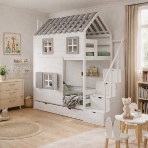 Idealno za: Dečije sobe, Montessori enterijere, Porodice sa dvoje dece, Roditelje koji traže premium dečiji krevet od punog drveta
